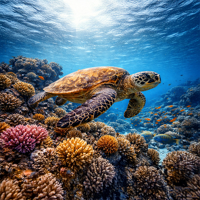 Bekannt für zutrauliche Grüne Meeresschildkröten und gelegentliche Gitarrenhaie.