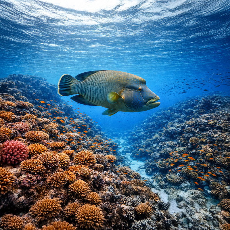 Das östliche Plateau (18–32 m) ist Heimat zahlreicher Fischarten, Napoleons und Kleinstlebewesen.